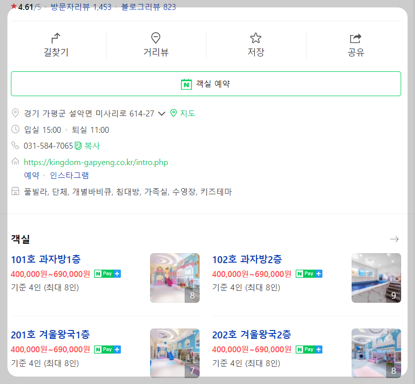 객실예약- 네이버와 킹덤키즈 홈페이지