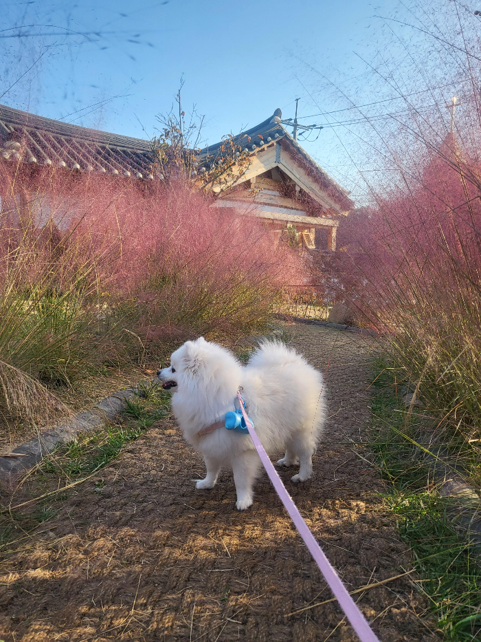 우리 강아지도 핑크뮬리 산책했어요.