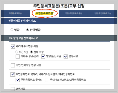 - 과거의 주소변동사항: 전체 (합산 10년이상 거주자) 또는 최근 5년 (계속 3년이상 거주자)