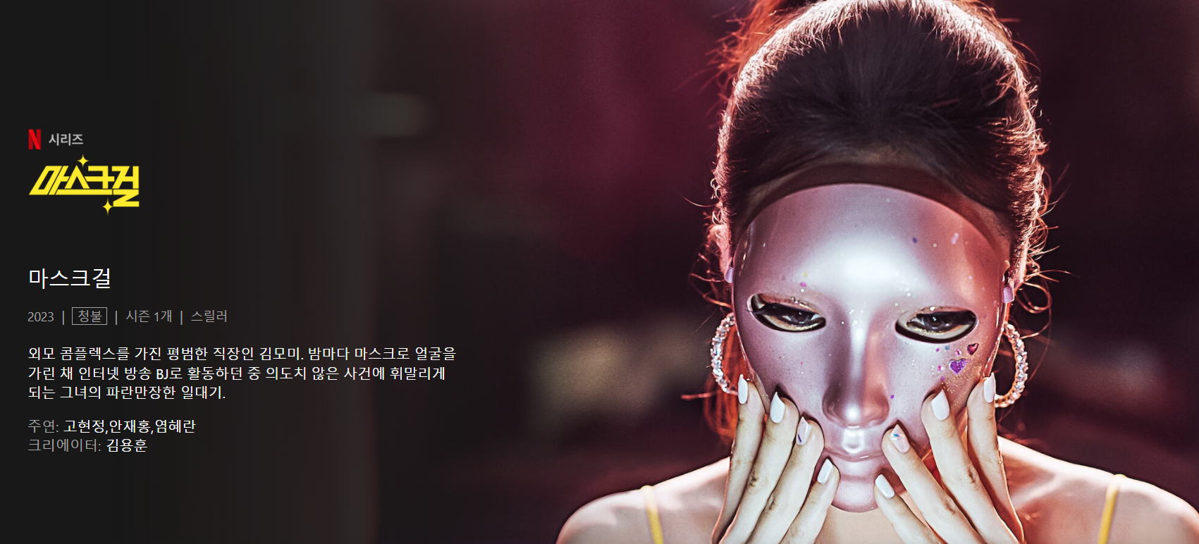 | 외모 콤플렉스를 가진 평범한 직장인 김모미가 밤마다 마스크로 얼굴을 가린 채 인터넷 방송 BJ로 활동하면서 의도치 않은 사건에 휘말리며 벌어지는 이야기로, 김모미의 파란만장한 일대기를 그린 넷플릭스 시리즈 | |