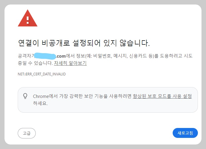 월요일 아침 블로그를 확인하는데 보안 인증서 문제로 연결이 비공개되고 콘텐츠 차단겁니다. 지금 제 글을 보고 계시는 여러분처럼 정말 당황했습니다. 확인해 보니 인증서가 기간이 만료됐다고합니다. 당황하지 마시고 현재 상황에서 가장 빠르게 조치할 수 있는 방법을 알려드리도록 하겠습니다.