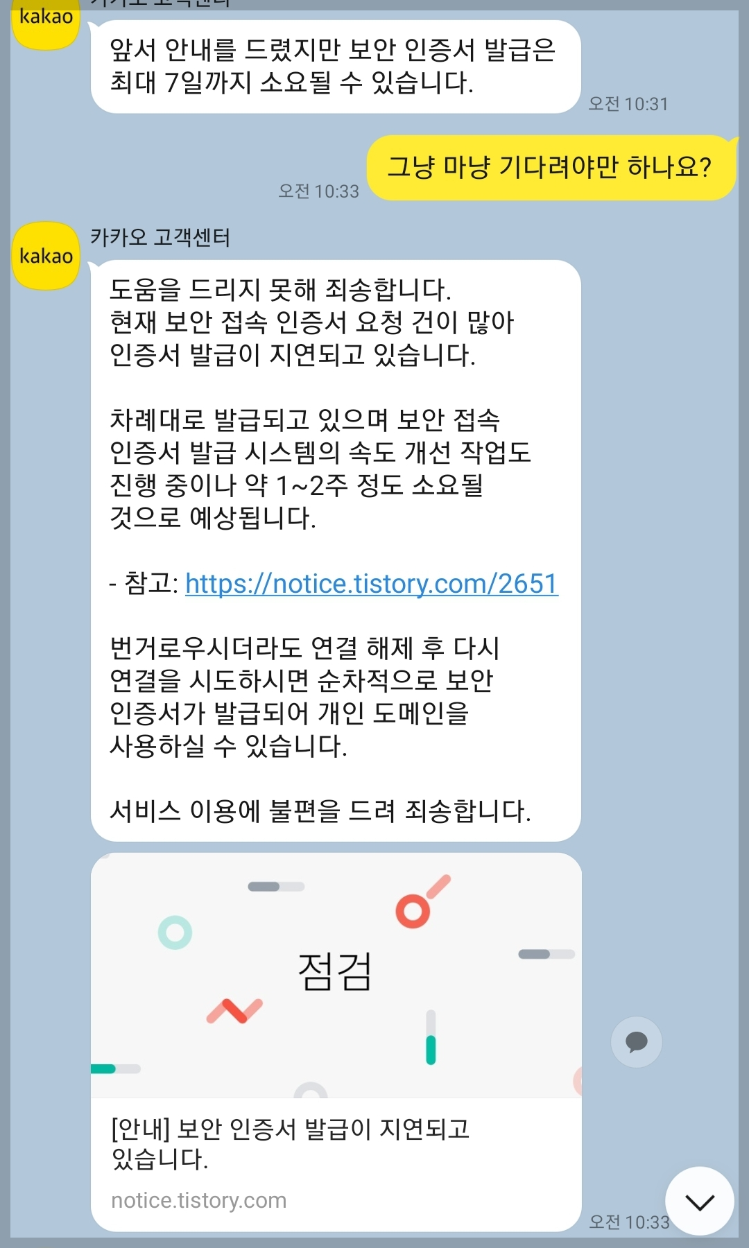 티스토리 블로그들이 자체 서버문제로 안되는 블로그들이 생겼다고 합니다. 말도 안되는 상황이라 급격하게 발급신청이 많아 늦어진다고들 하더라구요.