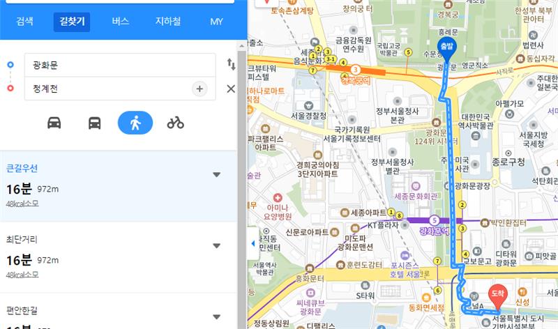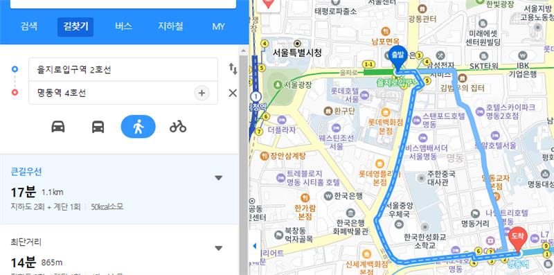 대중교통 및 도보 여행 코스는 이렇게 진행했어요.