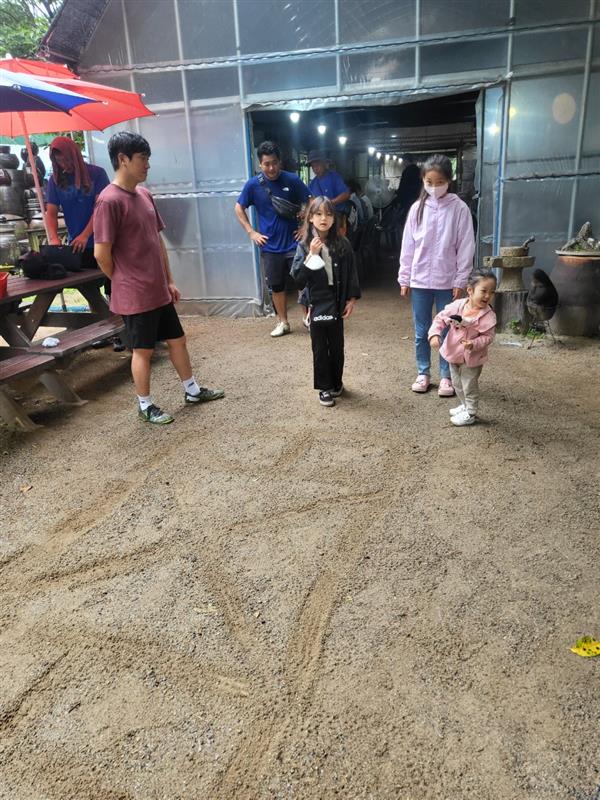비가 좀 내리는 날이었지만 족구와 앞마당에서 놀기에는 부족함이 없는 날씨였습니다. 특히 족구장이 나무들이 둘러싸여 있어 풍경이 좋았습니다. 사진에 보이는 하우스와 저와 딸들이 식사를 한 곳 말고도 건물내부와 옆쪽으로도 식사하실 수 있는 공간들이 충분히 있어서 단체모임하시기에 정말 부족함이 없으실 겁니다.