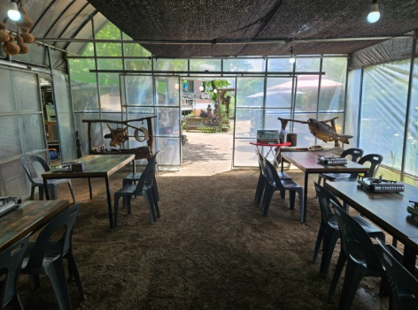 지도에 보시는 것처럼 아파트 단지 뒤로 조금 올라가는 산속에 있다 보니, 그 속에 있기만 해도 절로 힐링이 되는 공기 좋은 식당입니다. 족구장까지 준비되어 있어 단체모임에서 충분히 즐기실 수 있습니다.