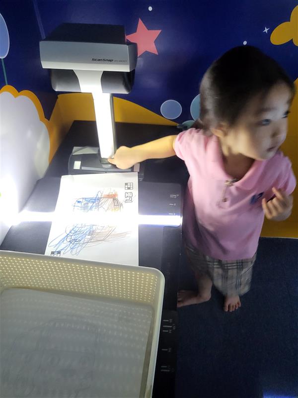 아이가 색칠한 그림을 위에 보이는 기계로 스캔하면 벽면에 그 그림이 나오니 많이 좋아합니다.