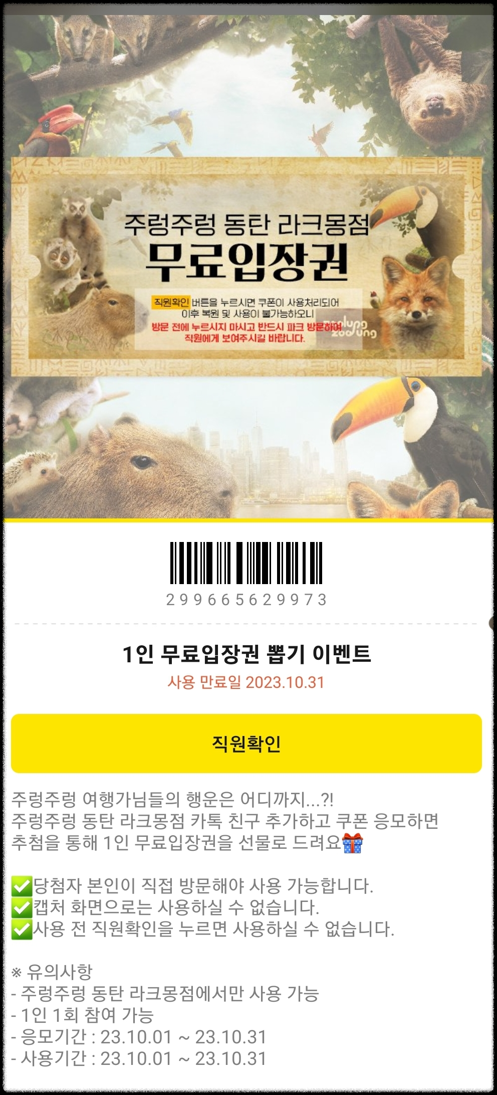 2. 쿠폰탭에서 1인 무료입장권 뽑기 클릭~~~