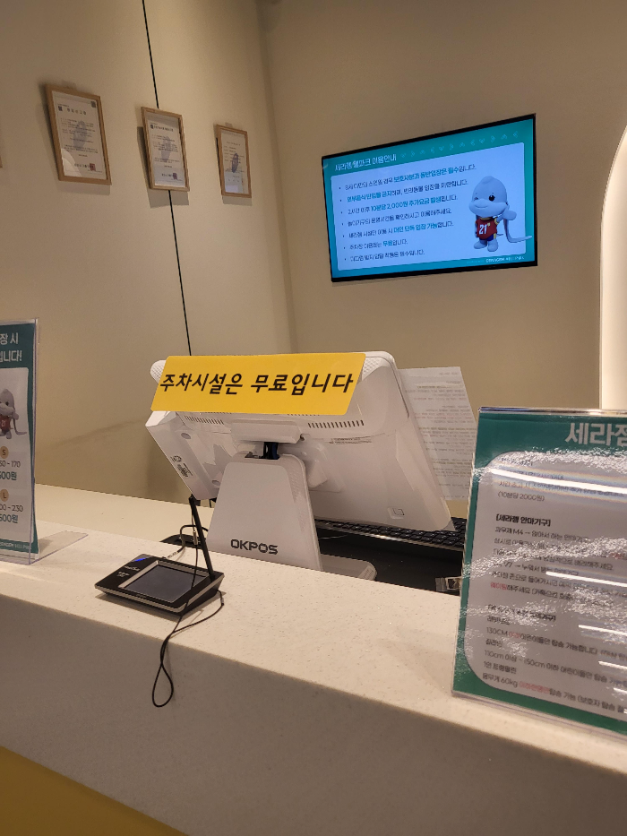 주차는 무료입니다. 이곳에 오시면 세라젬웰파크 뿐만 아니라 다이노베이도 있고, 건너편에 이케아도 있고, 위쪽으로 롯데프리미엄아울렛도 있습니다.
