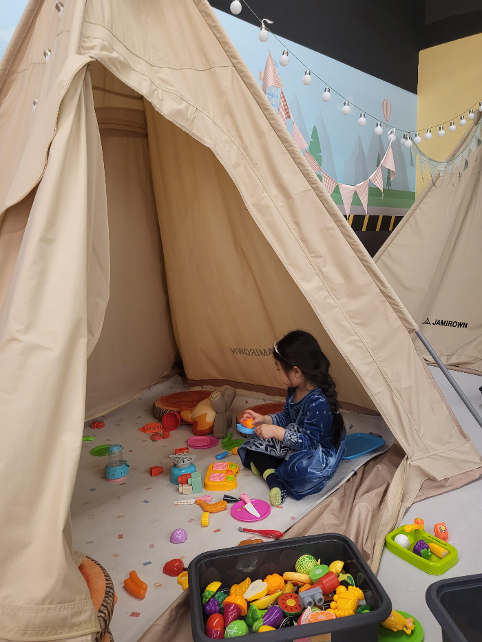 캠핑놀이를 할 수 있는 공간입니다.여기저기 뛰어 놀며 힘들었던 우리딸과 저는 이곳에서 캠핑 감성을 느끼며