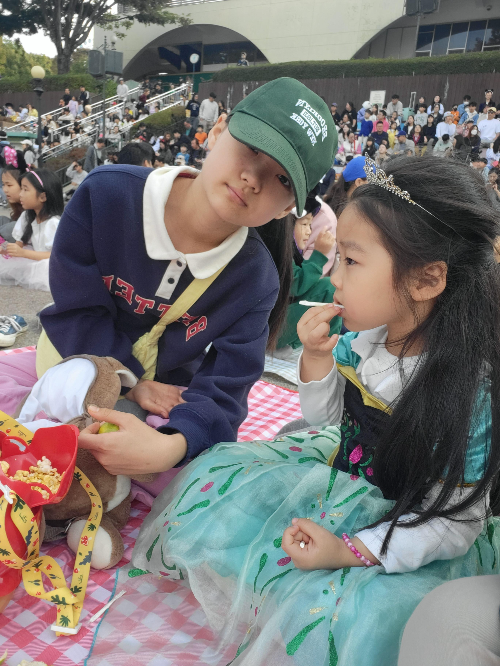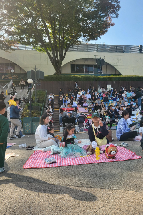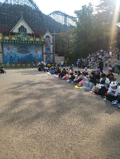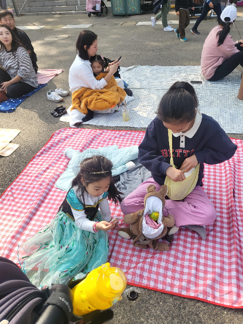 이 앞자리가 명당인 이유는, 바로 퍼레이드를 가깝게 볼수 있다는 것도 있지만, 제일 좋은건 시작되면 앞으로 나가 함께 퍼레이드 속으로들어갈수 있다는 것예요. 앞에 있지 않다면 아이들을 데리고 왔다 갔다 하면서 돗자리들 사이로 연신 "죄송해요"라고 말을 하시게 될꺼에요. 사진도 찍기도 좀 불편한데, 저희는 누워서 맘편히 사진도 찍고,바로 나가서 춤도 출 수 있었고, 퍼레이드 캐릭터분과 하이파이브도 쉽게 할수 있었어요.