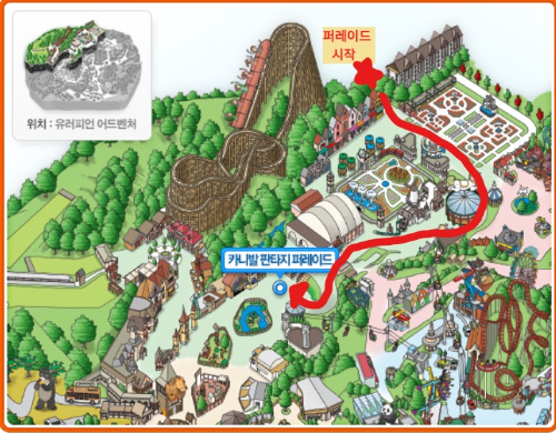 하지만,반대의 경우 퍼레이드는 보고 싶지만 너무 어린친구들과 왔기에 체력이 부족한경우와 시간적인 제약등등의 이유로 빨리가시고 싶으신분들이 계시죠? 이런분들은 시작점인 장미원과 회전목마 쪽에서 자리를 잡으시는걸 추천드립니다. 이유는 가장빨리 보시는것도 있지만, 집에 가시기에도 바로 위로 범범카 쪽으로 연결된 크루즈리프트를 탈수 있기 때문입니다.