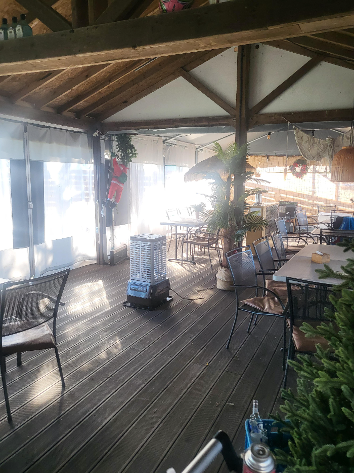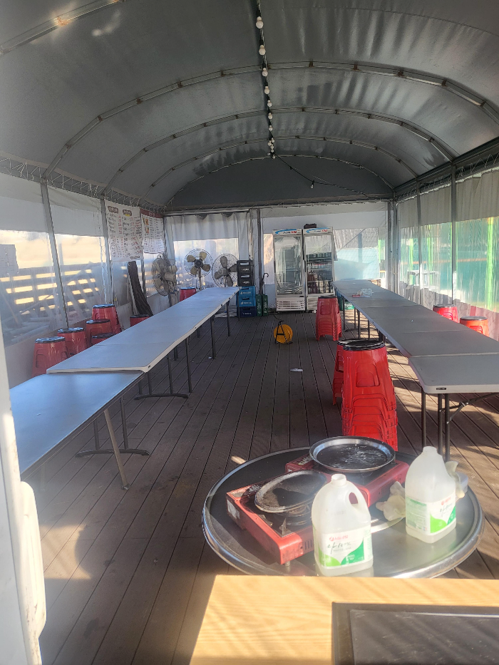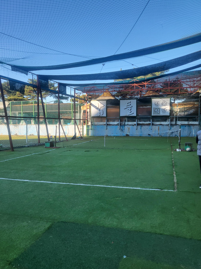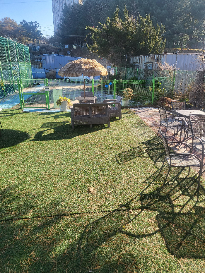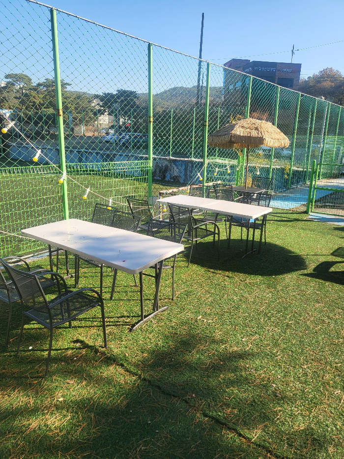 일반 흙바닥이나 콘크리트가 아닌 인조잔디로된 족구장에서 족구가 가능합니다. 앞뒤로 공간도 터져있는 게 아니라서 공이 멀리까지 가지러 갈 일도 거의 없고 경기하기 딱 좋았습니다. 바로 옆에 계단으로 올라가면 내외부 테이블이 있어 먹으면서 구경도 가능하고 족구공과 풋살공도 이미 구비되어 있어 바로 사용 가능한 곳이었습니다.