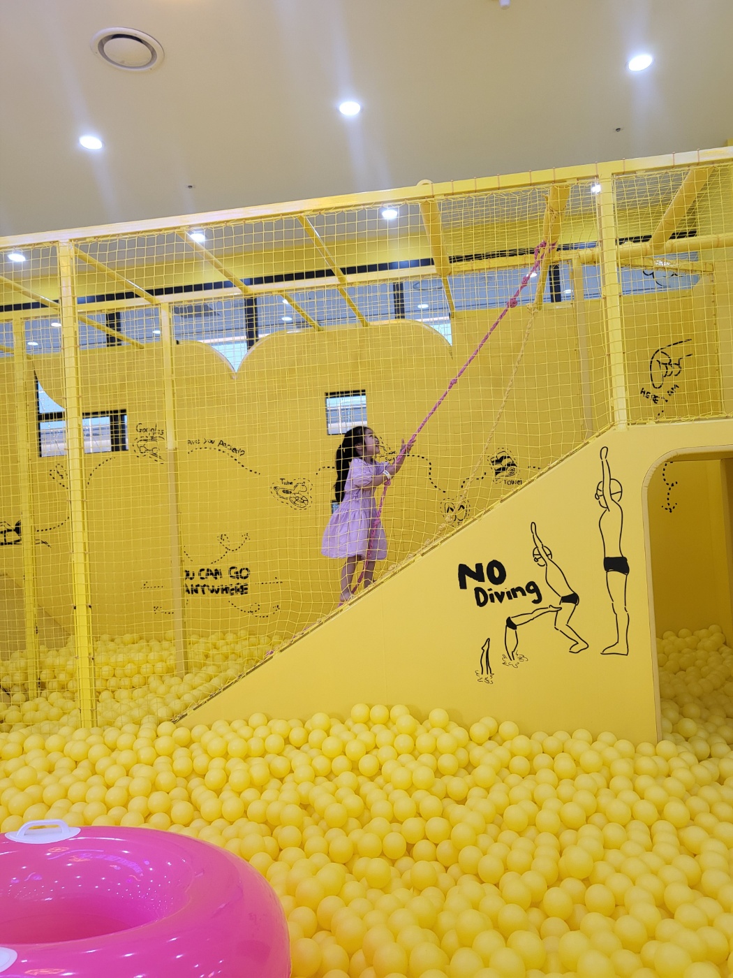 카페를 들어가면 우선 가장먼 큰 볼풀장이 보이는데 안에 들어가면 사진에서처럼 줄잡고 놀수 있는 곳과 튜브를 가지고 볼플장을 물속에서처럼 느끼며 놀수 있어 아이가 너무 좋아했습니다.