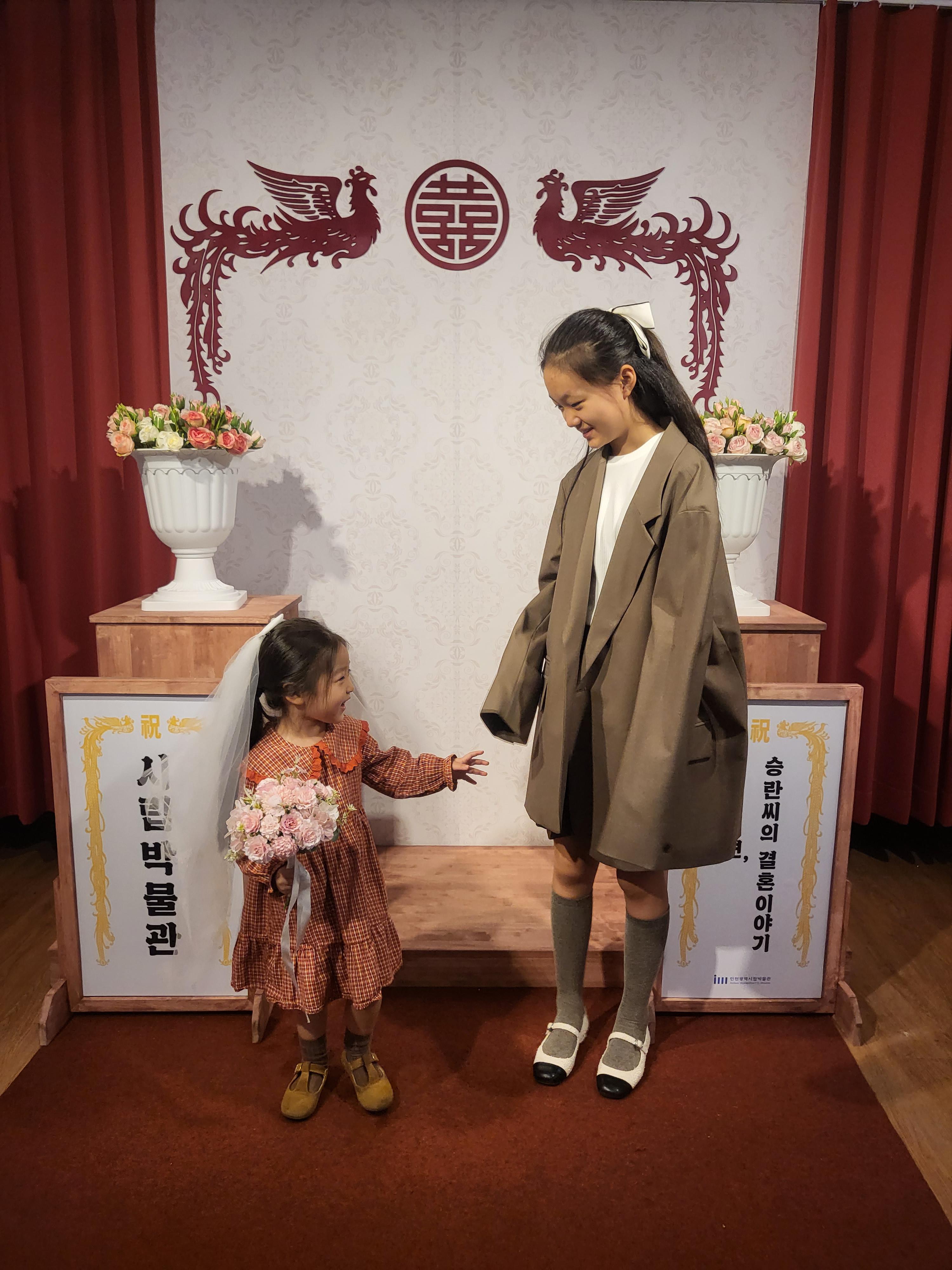 결혼식 부케와 면사포 그리고 양복재킷 등등 마음껏 입어보고 사진을 찍을 수 있게 해 놓았더라고요.그래서 언니는 신랑으로 변신,  동생은 신부로 변신하여 결혼하는 콘셉트로 사진을 찍었어요.