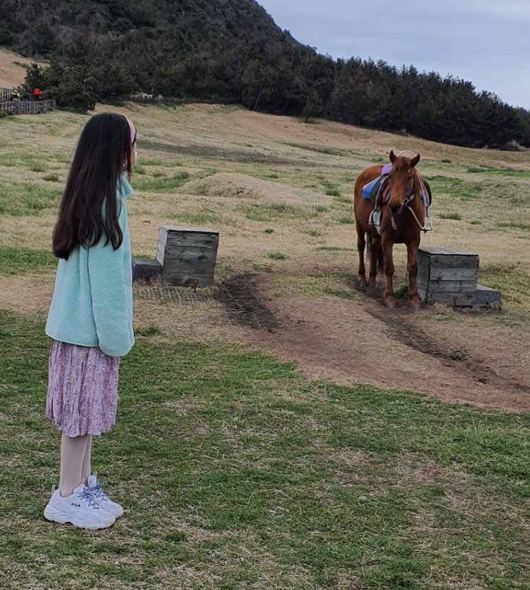 다른곳도 아니고 성산일출봉에서 말을 타볼 수 있다니 바로 첫째딸한테 물어보니 한번 타보겠니? 하고 물어보니 바로 좋다고해서 타기로 했습니다.