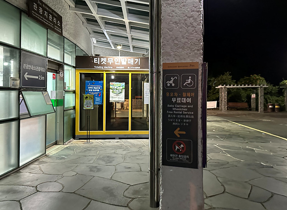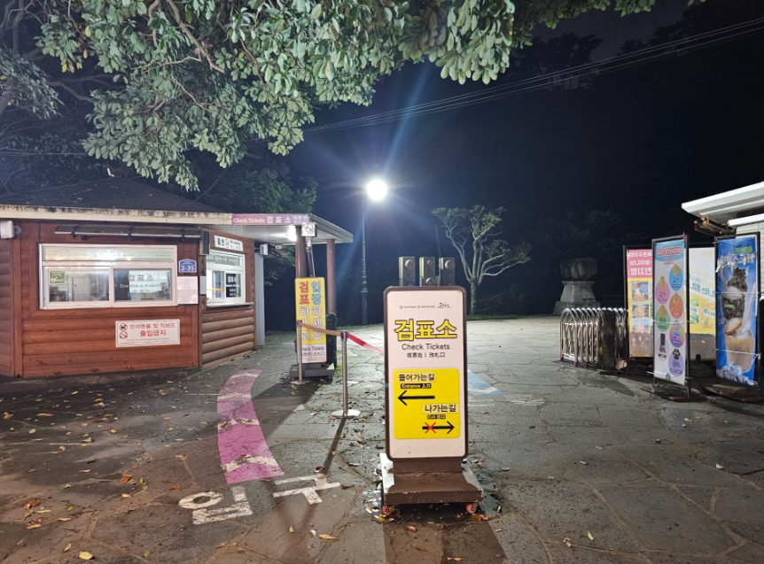 저희가 각자 숙소로 엄마와 둘째들을 내려준후 천지연폭포에서 모인시간이 저녁 8시30분정도였는데 주차장에 주차를 했는데 주변이 너무 깜깜해서 진짜 하는거 맞나? 안하는거 아닌가 했는데 간판을 보니 딱 발권기가 보이더라구요. 걱정하지마시고 입장하시면 됩니다.
