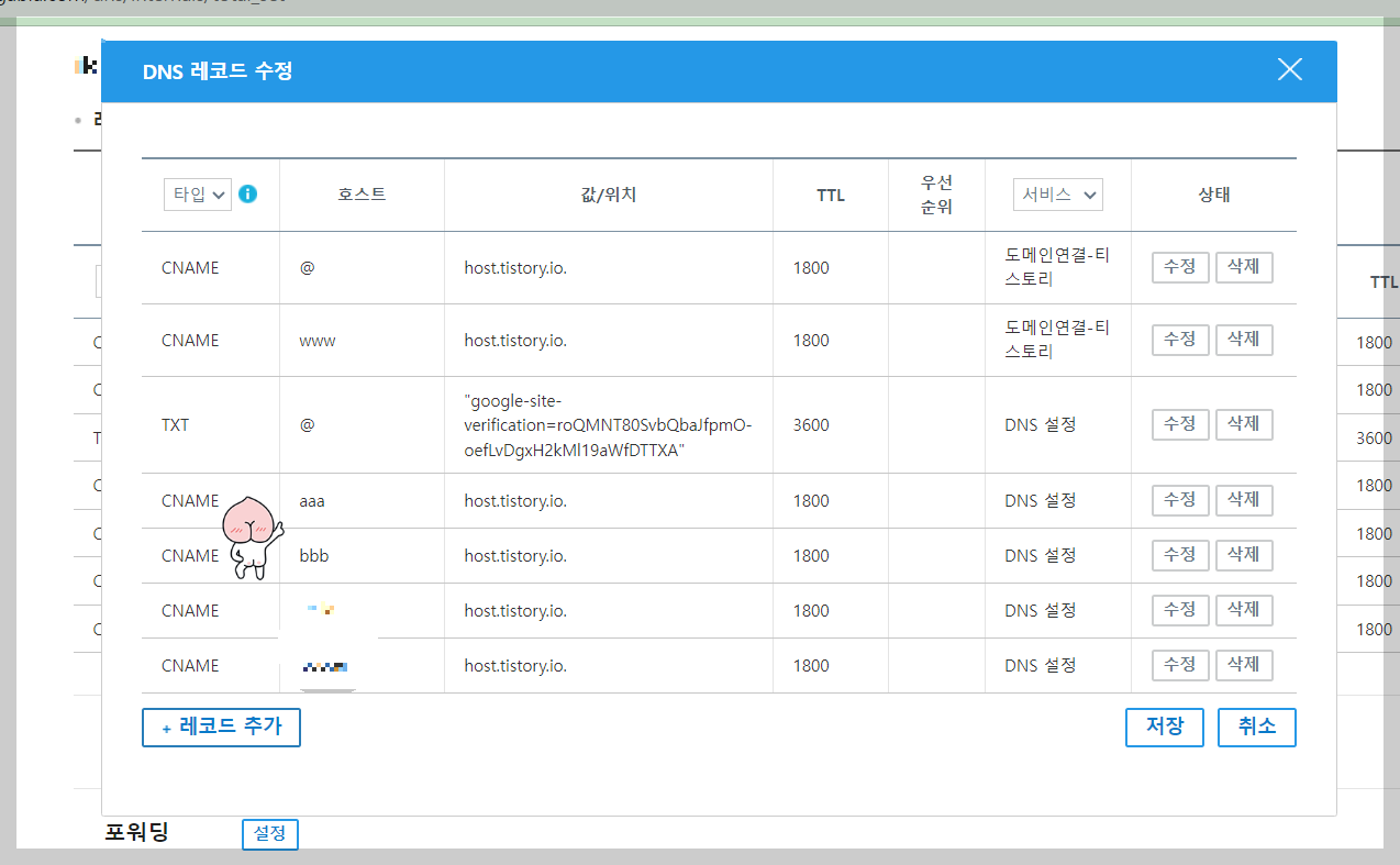 6. 타입은 CNAME , 호스트는 abc,123 등등 원하는 글자로 하시면되고, 값/위치는 host.tistory.io. 입니다. 마지막에 "." 점 을 꼭 찍으셔야 합니다. TTL은 1800 으로 설정하시길 추천드립니다.