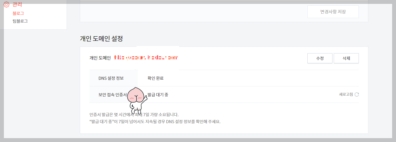 5. 나의 개인도메인 주소가 나올꺼고, DNS 설정 정보도 확인 완료로 나올껍니다. 근데 아직 보안 접속 인증서는 발급 대기중으로 나올껍니다. 보통 1 ~ 2시간 안에 발급이 됩니다. 혹시나 더 걸릴 수 도 있으나 걱정마시고 기다리시면 됩니다. 기본적으로는 7일안에 발급이 된다고 하니까 너무조급해마시고 새로고침을 해보시면 "발급완료"로 나오면 모든연결이 된겁니다.