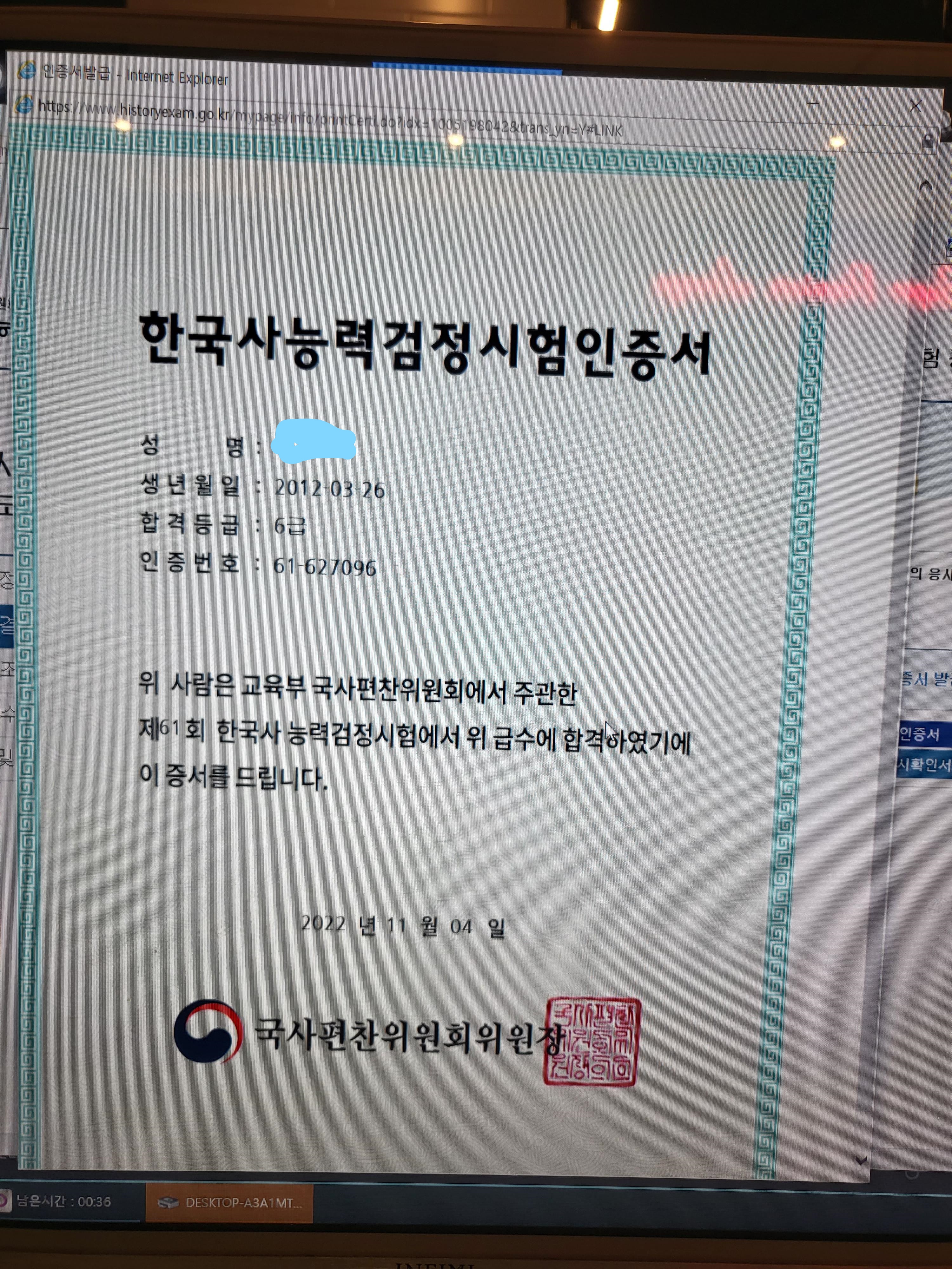 바로 내껀 빼버리고 우리딸 한국사능력시험인증서를 넣었다.